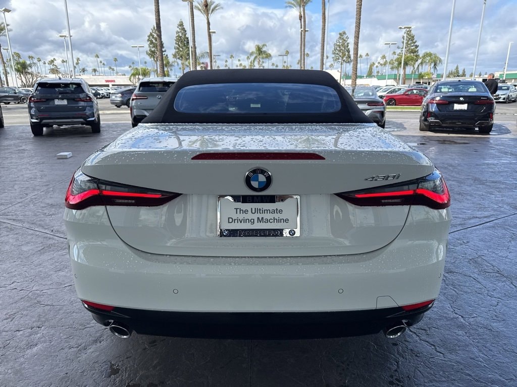 Balance of Factory Warranty still applies. New Price! Clean CARFAX. Alpine White 2026 BMW 4 Series 430i RWD 8-Speed Automatic Sport 2.0L 4-Cylinder TwinPower Turbo BMW First Aid Kit, One Owner, New Tires, Bluetooth, BACK UP CAMERA, Navigation/ GPS/ NAV, 10 Speakers, 4-Wheel Disc Brakes, 48V Mild Hybrid System, ABS brakes, Air Conditioning, Alloy wheels, AM/FM Radio, AM/FM radio: SiriusXM with 360L, Apple CarPlay and Android Auto Compatibility, Audio memory, Auto High-beam Headlights, Auto-dimming door mirrors, Auto-dimming Rear-View mirror, Automatic temperature control, BMW Assist ECall, BMW TeleServices, Brake assist, Bumpers: body-color, Compass, Connected Package Pro Limited Term, ConnectedDrive Services, Convenience Package, Convertible roof lining, Convertible roof wind blocker, Delay-off headlights, Driver door bin, Driver vanity mirror, Dual front impact airbags, Dual front side impact airbags, Electronic Stability Control, Emergency communication system: BMW Assist eCall, Exterior Parking Camera Rear, Four wheel independent suspension, Front anti-roll bar, Front Bucket Seats, Front Center Armrest, Front dual zone A/C, Front reading lights, Fully automatic headlights, Garage door transmitter, Genuine wood console insert, Genuine wood dashboard insert, Glass rear window, Harman/Kardon Surround Sound System, Heated door mirrors, Heated Front Seats, Heated front seats, Heated Steering Wheel, Hi-Fi Sound System, HVAC memory, Illuminated entry, Integrated roll-over protection, Knee airbag, Leather steering wheel, Low tire pressure warning, Lumbar Support, Memory seat, Navigation, Navigation System, Occupant sensing airbag, Outside temperature display, Overhead console, Panic alarm, Parking Assistance Package, Parking Assistant Plus, Parking View with 3D View (Surround View), Passenger door bin, Passenger vanity mirror, Perforated SensaTec Upholstery, Personal ESIM 5G, Power convertible roof, Power door mirrors, Power driver seat, Power Front Seats, Power passenger seat, Power steering, Power windows, Radio data system, Rain sensing wipers, Rear anti-roll bar, Rear reading lights, Rear seat center armrest, Rear window defroster, Remote Engine Start, Remote keyless entry, Security system, SiriusXM with 360L and 1 Year Trial Subscription, Speed control, Speed-sensing steering, Speed-Sensitive Wipers, Split folding rear seat, Sport Seats, Sport steering wheel, Steering wheel mounted audio controls, Tachometer, Telescoping steering wheel, Tilt steering wheel, Traction control, Trip computer, Turn signal indicator mirrors, Variably intermittent wipers, Wheels: 19" x 8" Front and 19" x 8.5" Rear Y-Spoke Bicolor, Widescreen Display, Wireless Device Charging.